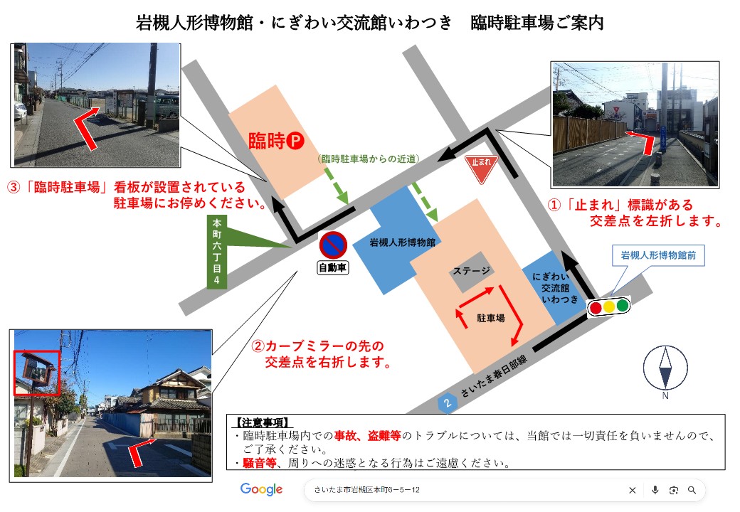 東北自動車道から岩槻ICより国道16号線を春日部方面へ約3.5㎞進み、城町2丁目の交差点を左折し、信号2つ目を左折すると約1.2㎞先左側が博物館駐車場となります。