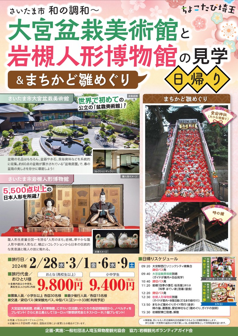 一般社団法人埼玉県物産観光協会が企画・実施する「さいたま市 和の調和~大宮盆栽美術館と岩槻人形博物館&まちかど雛めぐりの見学」ツアーが現在販売中です。大宮盆栽美術館、岩槻人形博物館、にぎわい交流館いわつき、まちかど雛めぐりを1日で回る日帰りバスツアーとなります。