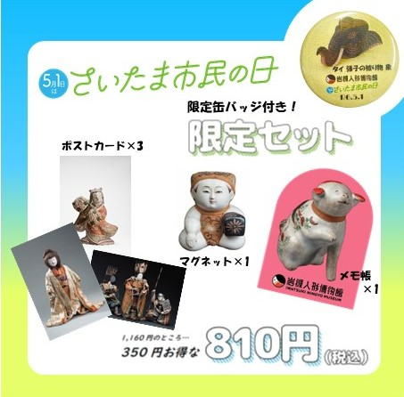 また、2024年さいたま市民の日限定で、博物館オリジナルグッズを詰め合わせた「さいたま市民の日限定セット」を販売します。通常は、1,160円のところ350円お得な、810円で販売します。限定セットをお買い上げの方には、開催中の特集展示の作品を使ったオリジナル缶バッジをプレゼント!