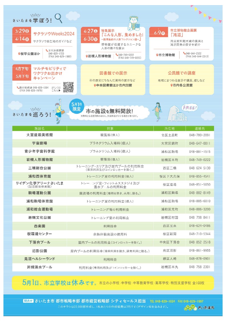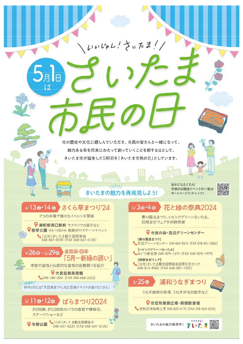 本市では、市の歴史や文化に親しんでいただき、市民の皆さんと一緒になって、魅力ある市を将来にわたって創っていくことを期する日として、さいたま市が誕生した5月1日を「さいたま市民の日」としています。