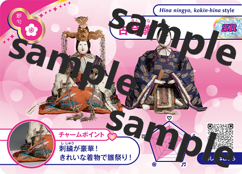 カード表面左上にあるマークは5種類あります。それぞれ「古典人形」「節句人形」「創作人形」「郷土玩具」「海外の人形」を表現しています。