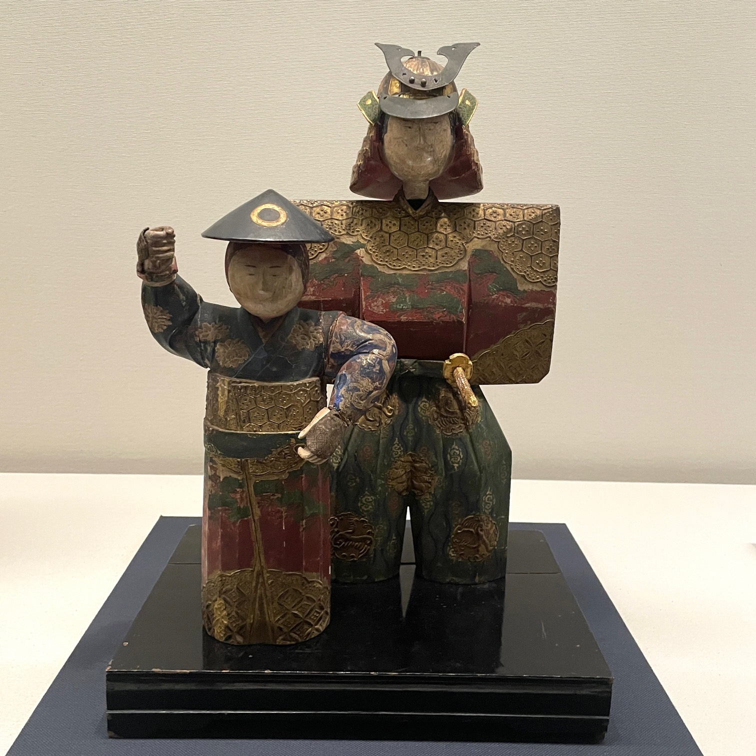 節句人形コーナーでは、三・五の節句共用で飾ることができる珍しい作品の「三五雛」と、雛道具の一つとして「貝合(かいあわせ)」を展示しました。 「三五雛」は、木彫りに置き上げ彩色が施された嵯峨人形風で、立雛と武者人形を一体化したようなユニークな造形です。優雅な次郎左衛門頭にもかかわらず、男雛は兜、女雛は陣笠を被っています。女雛の勇ましく振り上げた腕には、五月人形の旗持ちの如く旗指物が掲げられていたのでしょうか。 「貝合」は、物語や花鳥などを描いた貝を用いる遊びで、貝に入れる容器を貝桶と言います。二枚貝は他の貝と合わさることがないということから、貝桶は貞節の象徴として婚礼調度のなかでもっとも重要とされたそうです。当時の雅な遊びに想像が膨らんでいきます。