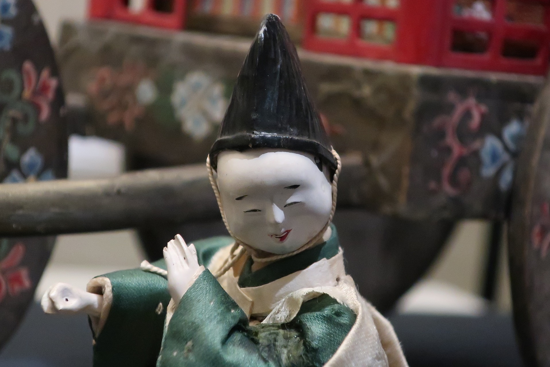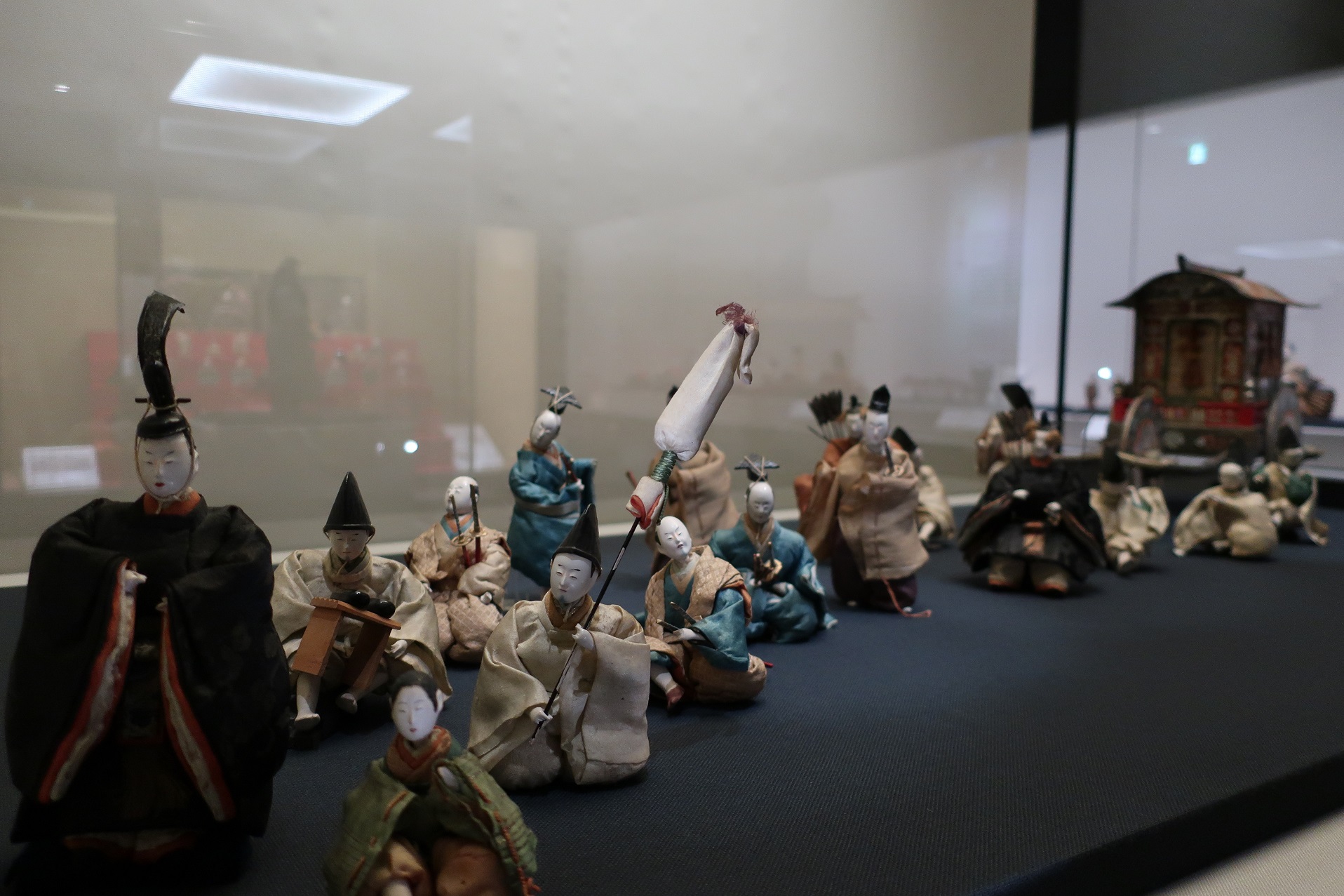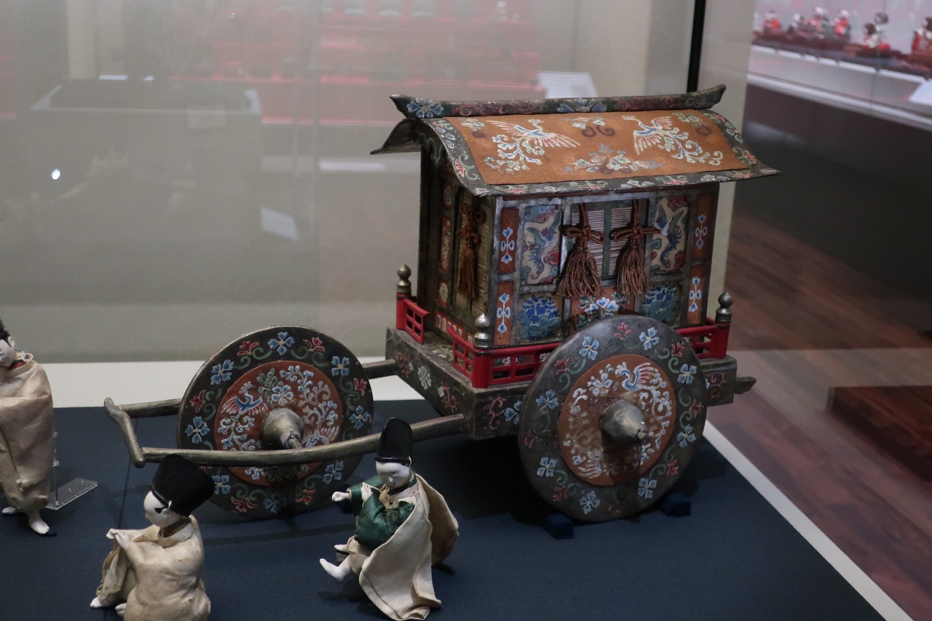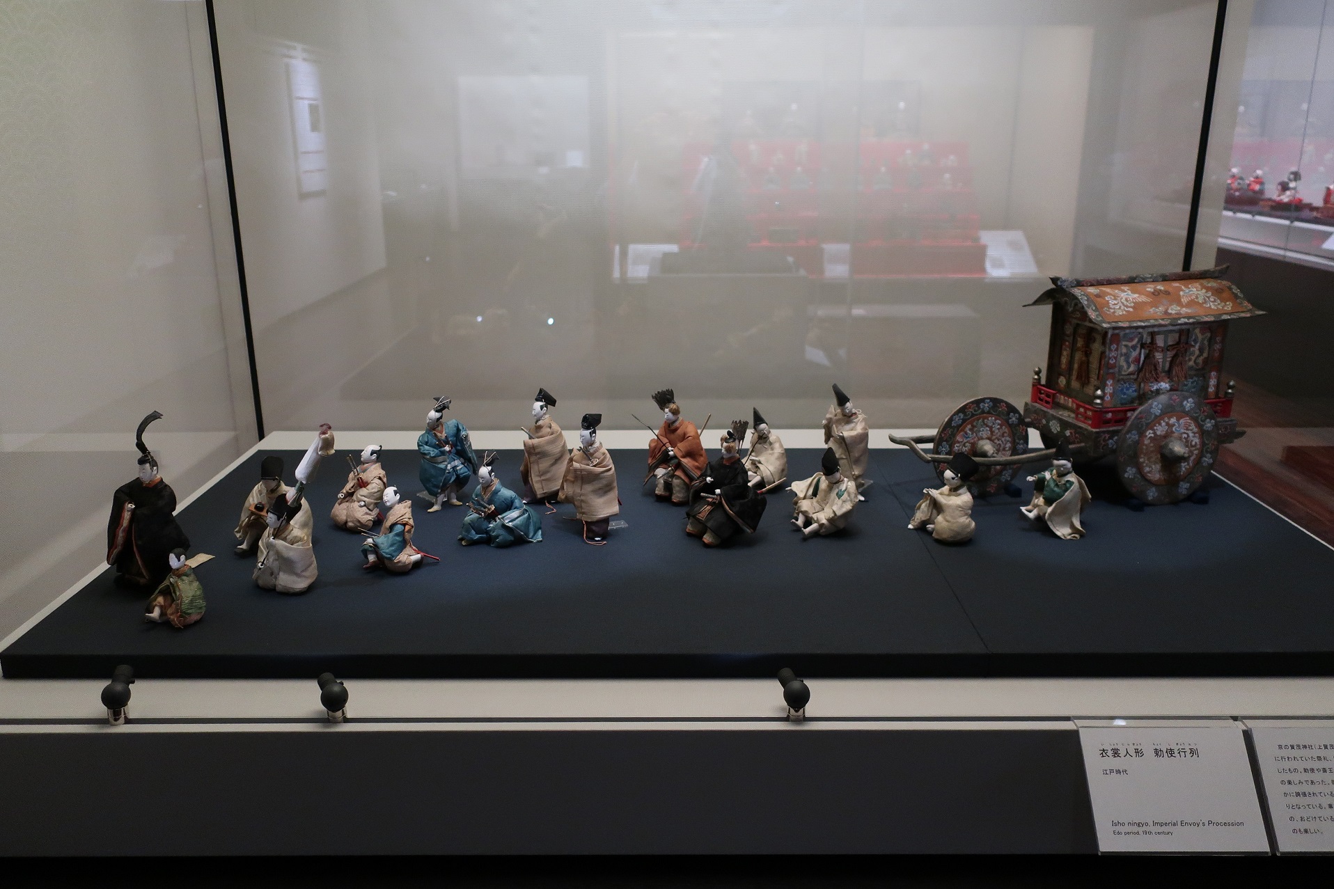 展示されている御所車は人形の世界らしく華やかに誇張されていますが、人形の衣装は概ね忠実な